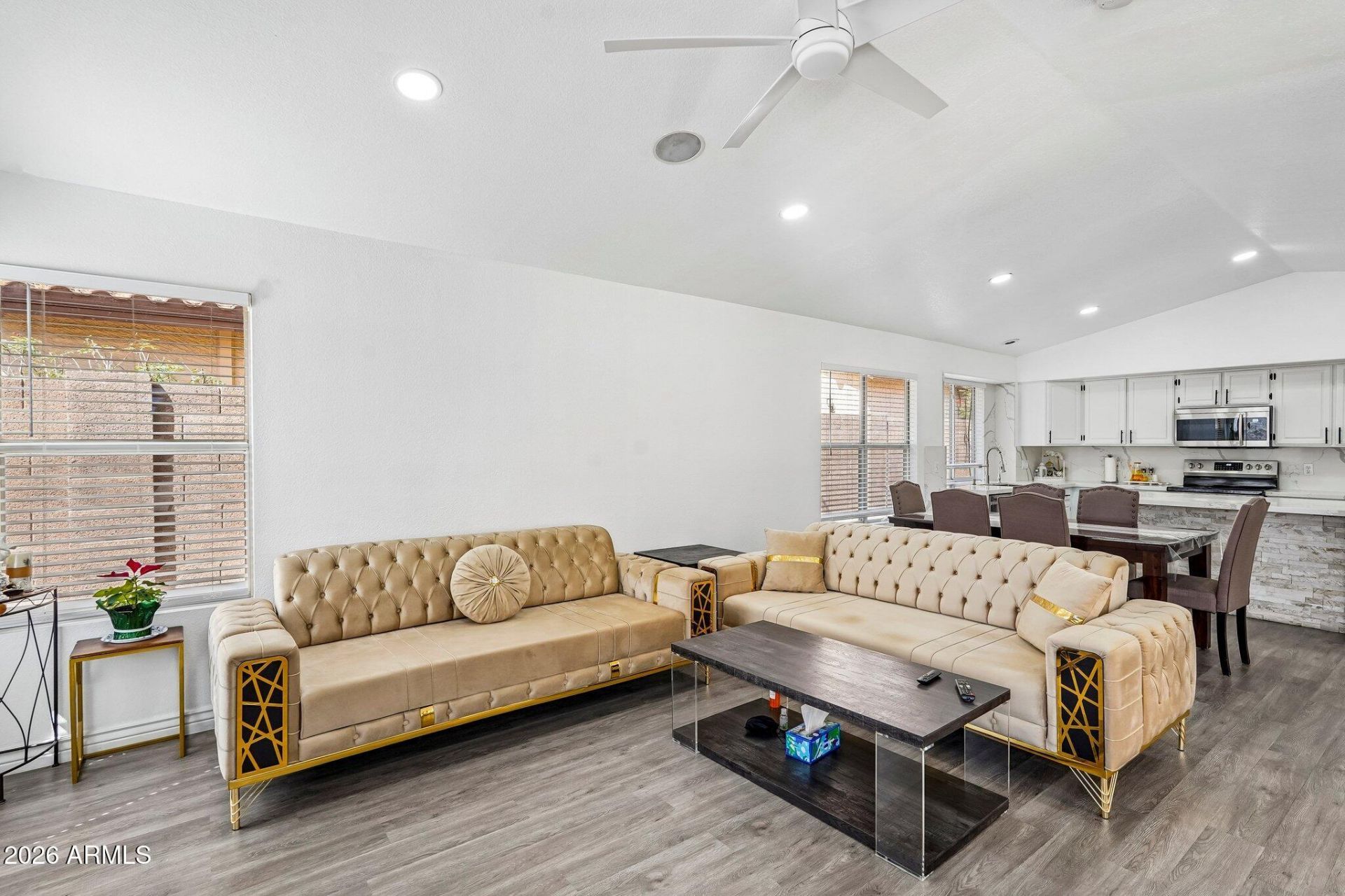 Stunning updated Glendale home with pool and 3-car garage in a prime location! This 4 bedroom, 2 bathroom single-story home in Glendale, AZ offers the perfect blend of modern upgrades, open-concept living, and an entertainers backyard. Updated in 2022, the home features vaulted ceilings, luxury vinyl plank flooring, recessed lighting, and neutral paint throughout, along with a spacious layout that includes formal living and dining areas plus an open family room ideal for entertaining. The upgraded kitchen showcases quartz countertops, waterfall island, stainless steel appliances, white cabinetry, walk-in pantry, and reverse osmosis system. The split primary suite provides privacy with backyard access and a spa-style bathroom featuring dual vanities, soaking tub, separate shower, and walk- in closet. Step outside to your resort-style backyard with a fenced diving pool, covered patio, paver seating area, and low-maintenance artificial turf landscaping, perfect for Arizona living. Additional highlights include a 3-car garage with built-in cabinets, water softener, indoor laundry with washer and dryer included, and energy-efficient systems, all located on a city-maintained street in Glendale with convenient access to shopping, dining, and freeways--a rare move-in ready opportunity