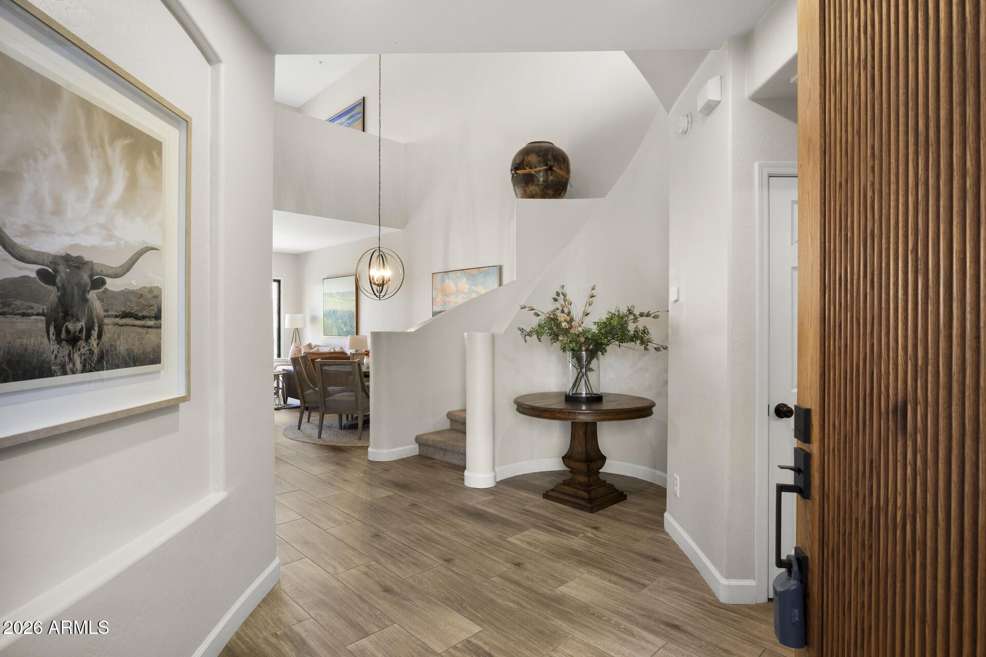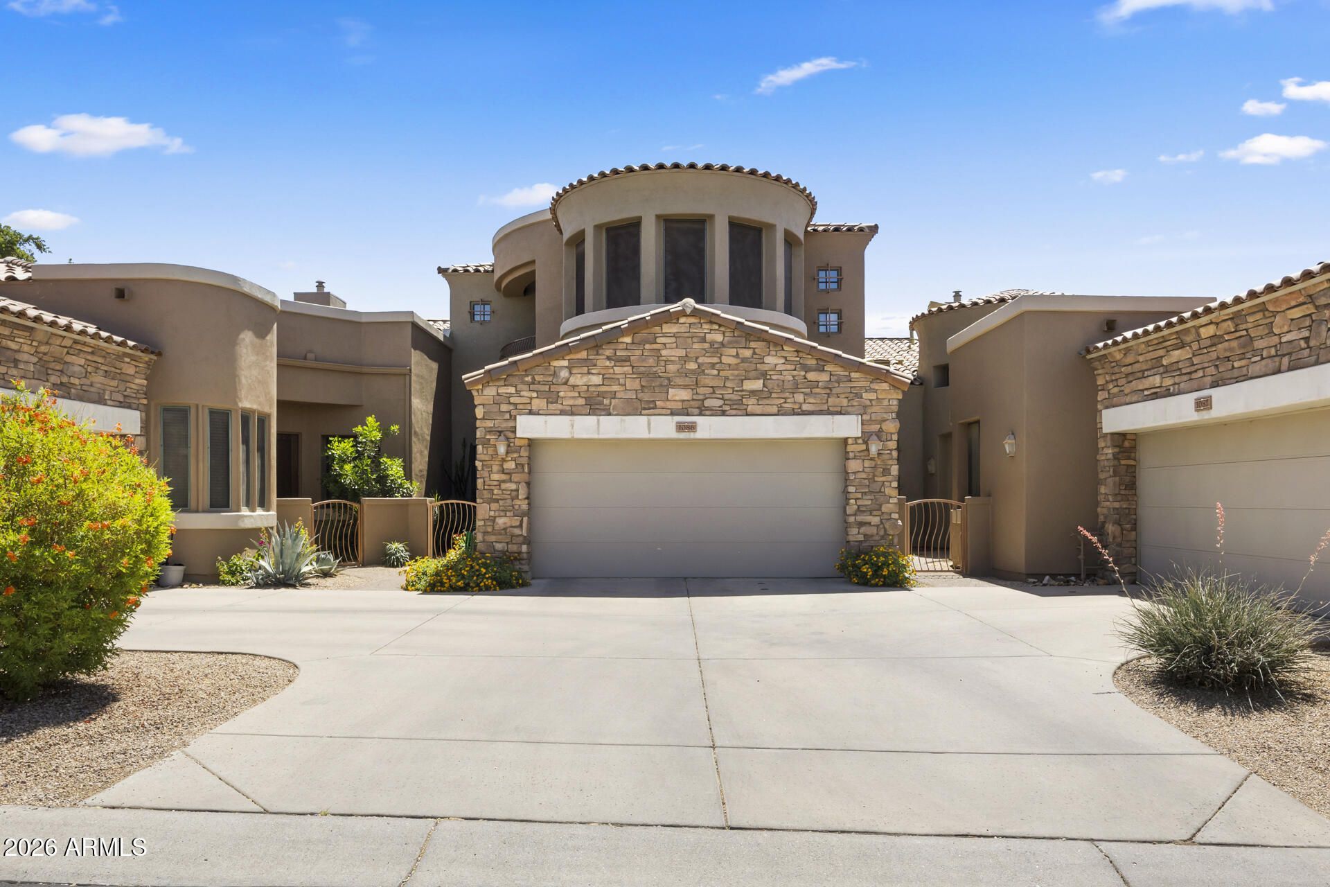 Truly Exceptional! Remodeled 3 bedroom 3.5 bath in Grayhawks desirable gated, Cachet neighborhood. A grand 2 story great room with fireplace and wood look tile opens to a center island kitchen with wine nook and beverage coolers- perfect for entertaining! Sliding doors reveal the re-imagined backyard with paver patio, built in BBQ, turf, & mountain views. The split floor plan ensures privacy with a 1st flr junior master, ensuite baths plus family room. The primary suite offers a stunning bath, balcony & sweeping mountain views. Perfect as a full time home or lock and leave! Community amenities include a fully equipped gym, heated pools & BBQ. A prime location for resort style living-walkable & convenient to upscale shopping, dining & more-Grayhawk GC, DC Ranch Marketplace, Kierland