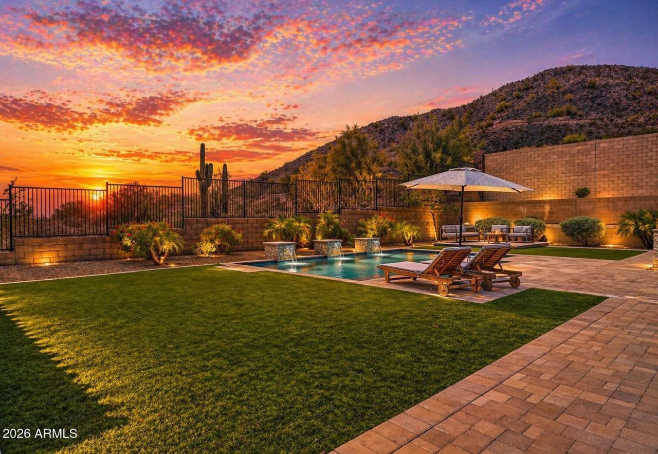 A private casita, nearly 0.5 acres, a resort-style pool, mountain views, and a cul-de-sac lot inside a gated community, this is the kind of home that rarely comes available. Tucked away in Montoro Preserve and backing to open desert, this property captures some of the most breathtaking sunsets in North Peoria while offering a level of privacy thats hard to find.From the moment you arrive, the curb appeal sets the tone with a striking stone exterior and a premium homesite with only one neighboring property. Inside the main home a thoughtfully designed floor plan blends comfort and functionality, featuring 4 bedrooms, 2 spacious flex rooms, 3.5 bathrooms and a seamless layout that makes everyday living and entertaining feel effortless. The gourmet kitchen is beautifully appointed with a cook top, built in oven and a generous walk-in pantry, all opening to the main living space anchored by a custom electric fireplace and built-in shelving.The backyard is where this home truly shines. Designed for Arizona living, the resort-style setting features a modern pebbletec pool with a waterfall feature, travertine decking, artificial turf, built-in BBQ, multiple seating areas, a fenced dog run and a view fence that frames the surrounding desert and mountain backdrop. A massive sliding glass door creates that coveted indoor-outdoor lifestyle, bringing the entire space together.Adding even more versatility, the detached casita includes a kitchenette and full bathroom- ideal for a private guest retreat, home office, gym, or multi-generational living.Additional highlights include a 3-car garage, oversized side yard with RV gate, and a 2018 build that offers the benefits of newer construction.Located just minutes from hiking trails, The Trailhead, and the growing Four Corners area, this home offers the perfect blend of privacy, lifestyle, and convenience in one of North Peorias most desirable gated communities.