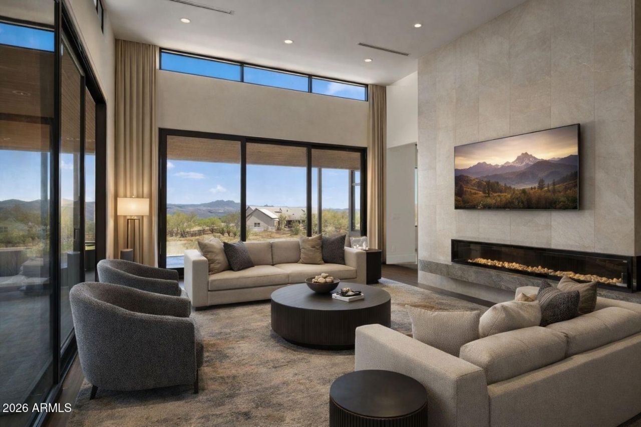 This new custom home sits on 1+ acre and is a stunning modern masterpiece offering luxury living and breathtaking panoramic mountain views. Its open-concept design features a spacious great room with a modern fireplace that flows seamlessly onto the expansive patio through a wall of sliding glass doors. The kitchen features a massive island, stainless-steel appliances, custom cabinetry, a butlers pantry/kitchen, and a large walk-in pantry. The primary bedroom is a private retreat with split vanities and 2 large walk-in closets. Roomy secondary bedrooms provide ample space and privacy. The extended-length patio is perfect for outdoor relaxation and entertaining while taking in the beautiful mountain views. Located near Tonto National Forest, the Verde River, and Trilogy Golf Course, this home combines modern design with natural beauty. Enjoy easy access to endless trails for hiking, biking, horseback riding, and off-roading. Experience stylish, comfortable living in a serene and private setting!