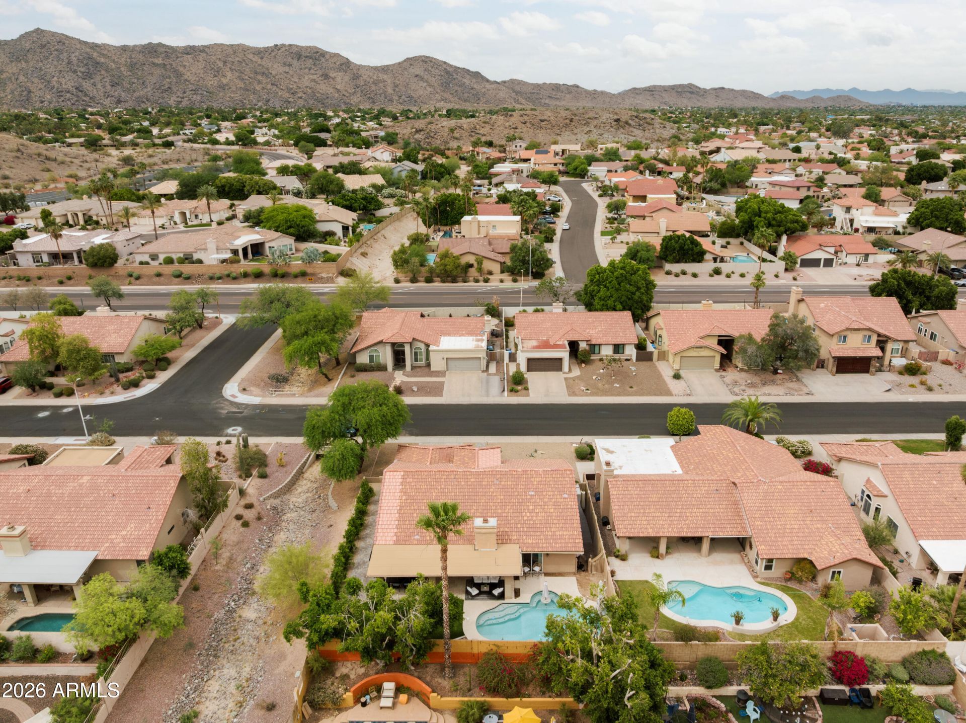 Gorgeous Ahwatukee home in Mountain Park Ranch with vaulted ceilings and seamless open-concept layout. This 3 bed, 2 bath home with office/flex space features elegant and modern updates throughout. The kitchen offers a large island with bar seating, shaker cabinets, custom built-in dishwasher, wine fridge, bay window seat, and opens to formal dining. The spacious living area includes a custom media console and cozy fireplace. Vaulted ceilings continue through the primary and secondary bedrooms, enhancing the open feel. Enjoy a private backyard oasis with mountain views, play pool, travertine tile, covered patio, turf and updated landscaping. Community amenities include 3 Jr. Olympic pools, spas, parks, and pickleball, tennis & basketball courts.