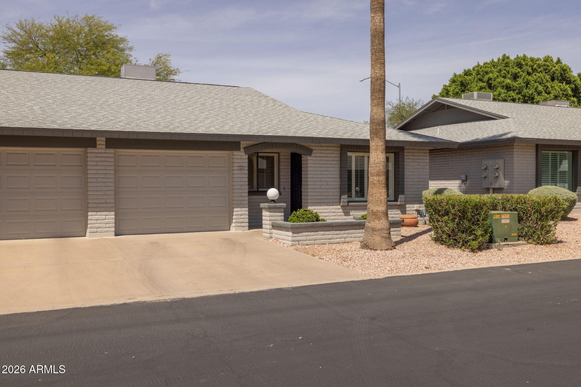 Located in the highly sought after Sunland Village East community, this well maintained home offers a functional split bedroom layout designed for both comfort and privacy, with inviting living and dining spaces enhanced by wood flooring and classic plantation shutters. The kitchen features sturdy oak cabinetry paired beautifully with light countertops, along with upgraded stainless steel appliances, creating a space that is both timeless and practical for everyday living. The primary suite is a relaxing retreat, complete with a walk in closet and an upgraded bathroom featuring quartz countertops with beveled edges that flow seamlessly into the sinks, along with updated fixtures and mirrors for a clean, modern feel. The guest bathroom has also been recently upgraded, offering a cohesive and refreshed look throughout the home. A built in office area provides the perfect dedicated workspace, while the same designer flooring carries throughout, creating a seamless and polished flow from room to room. Additional highlights include an interior laundry room for added convenience. Step outside to a beautifully landscaped backyard designed for year round enjoyment, featuring both a screened in covered patio and a separate open air patio, all surrounded by a private setting that feels like your own personal retreat. Sunland Village East is known for its vibrant, amenity rich lifestyle, offering residents access to pools, a clubhouse, fitness center, an 18 hole golf course, tennis, pickleball, and a full calendar of social events. This home offers the perfect blend of comfort, functionality, and lifestyle.